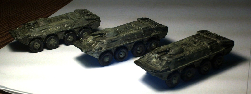 Tomorrow I'll paint the Loyalist troops themselves, in similar colors to their BTRs: olive-green uniforms and steel helms, armed with AK-74s, RPK-74s and RPG-7s.